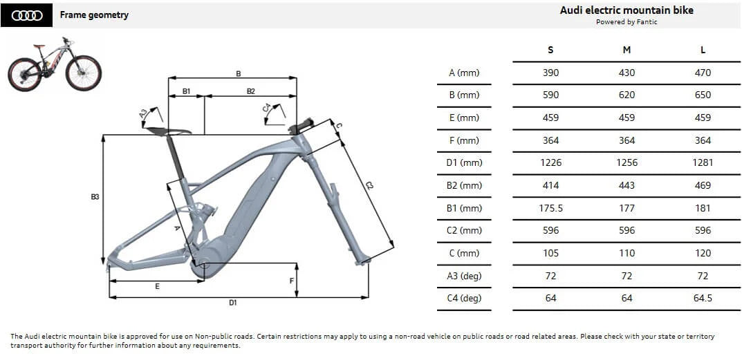The Audi electric mountain bike is approved for use on Non-public roads. Certain restrictions may apply to using a non-road vehicle on public roads or road related areas. Please check with your state or territory transport authority for further information about any requirements.