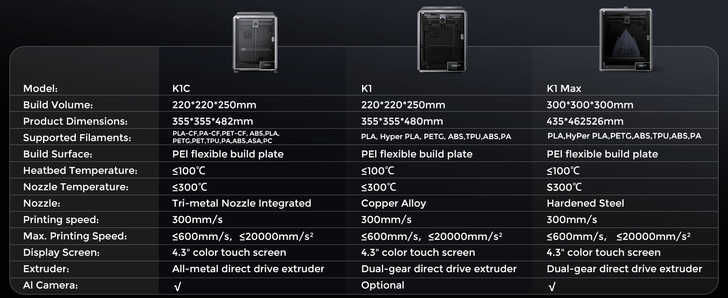 Creality K1C 3d printer supports to print PLA-CF/PET-CF, like jigs and fixtures, prototypes etc.