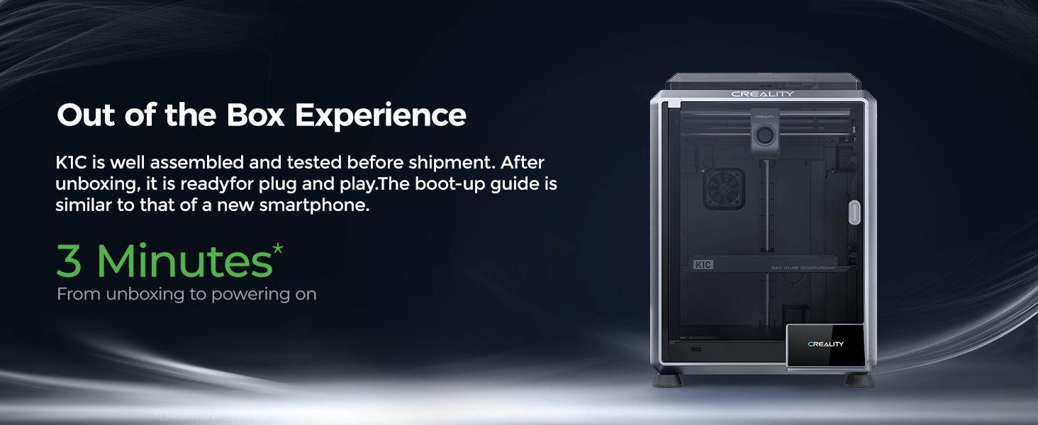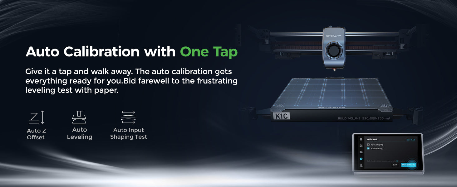 - Convenient Operation: Creality K1C is well assembled and tested before shipment. After unboxing, it is ready for plug and play. The boot-up guide is similar to that of a new smartphone. 3 minutes from unboxing to powering on, you can start print quickly. Also, the auto calibration help you to print easily. Auto Z offset, auto leveling and auto input shaping test, all of the auto operation save your time largly. Give it a tap and walk away. The auto calibration gets everything ready for you. Bid farewell to the frustrating leveling test with paper