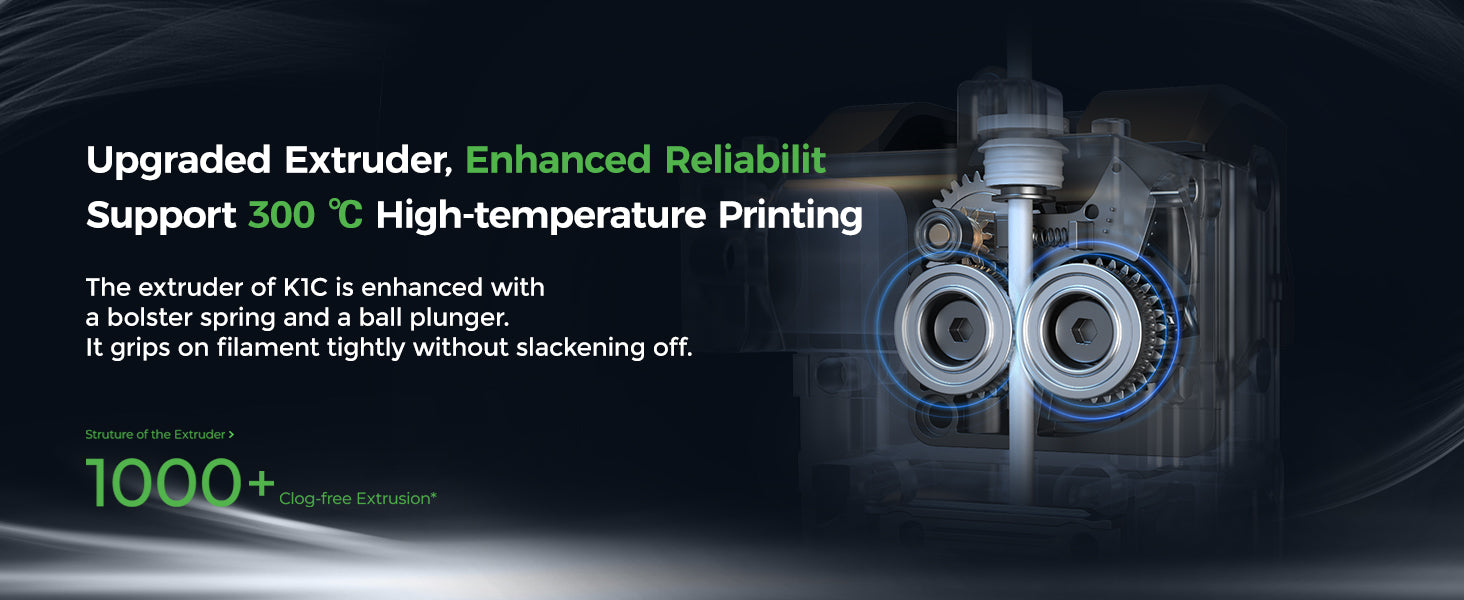 - Clog-free Direct Extruder: It can print carbon fiber filament and many kinds of filament. The K1C 3d printer equips a clog-free direct extruder enhanced a bolster spring and a ball plunger. It grips on filament tightly without slackening off. The durable steel-stipped copper nozzle is integrated with a titanium alloy heatbreak. It blocks heatcreep and can be swapped super easily. The extruder support 300℃ high-temperature printing