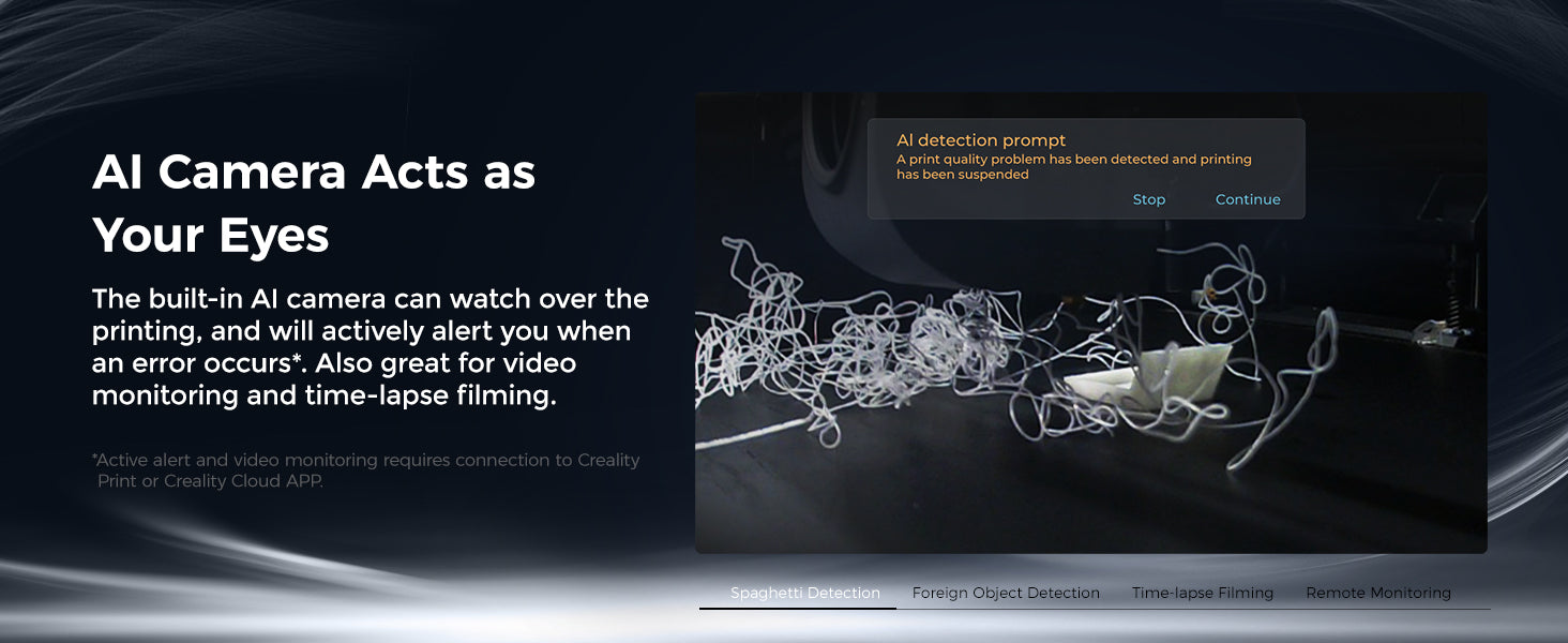 - Smart AI Function: Creality K1C equips observant AI Camera: Recognize spaghetti failure, foreign matter, debris, etc. and support real-time monitoring and time-lapse filming