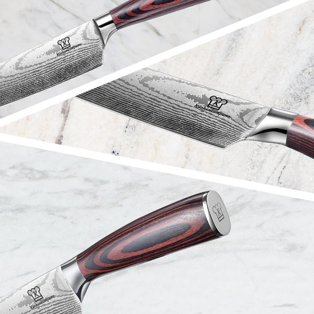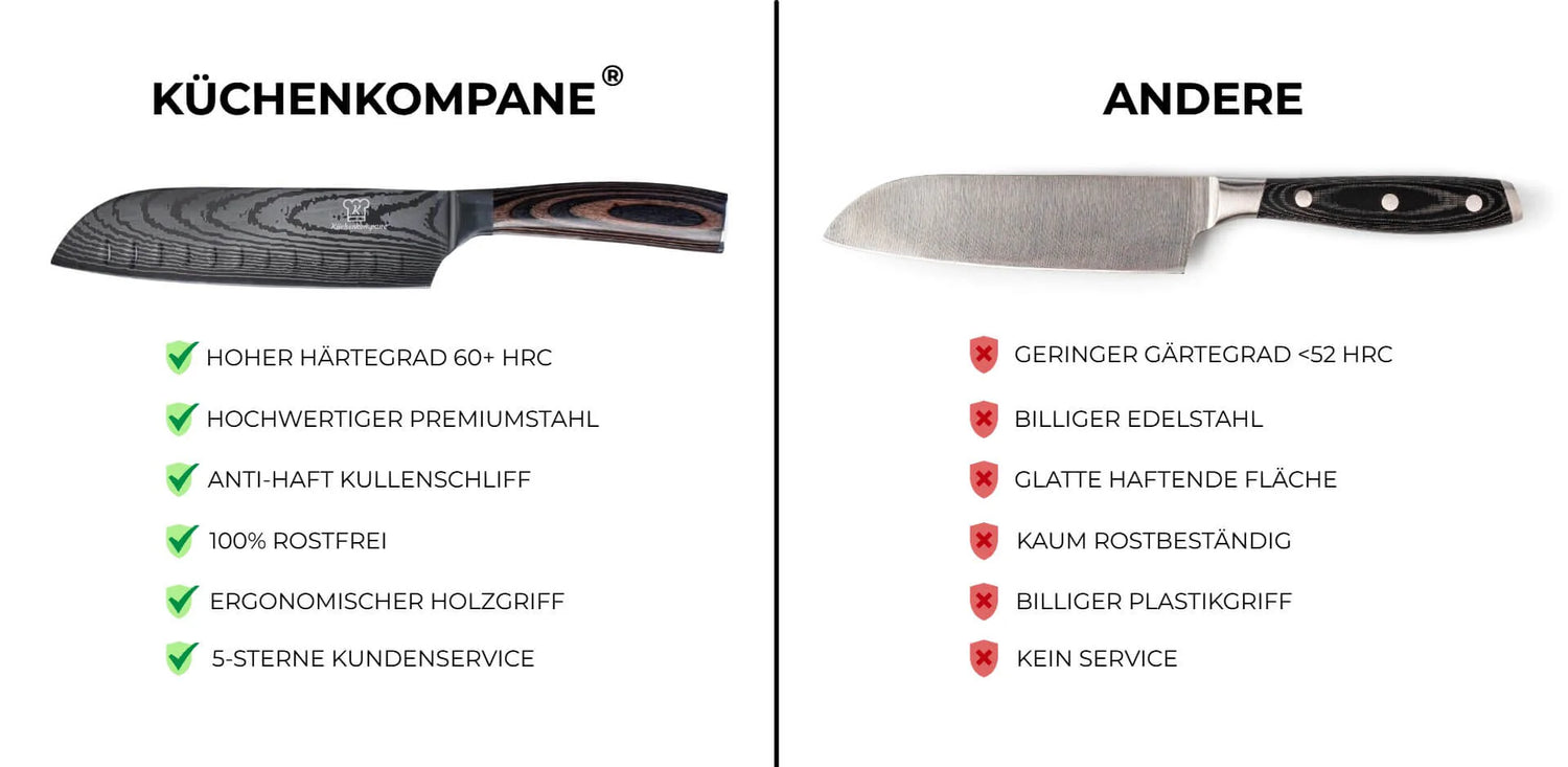 Our comparison graphic shows why Küchenkompane is the best choice. With razor-sharp precision, high-quality steel and ergonomic design, you'll have maximum quality and comfort.