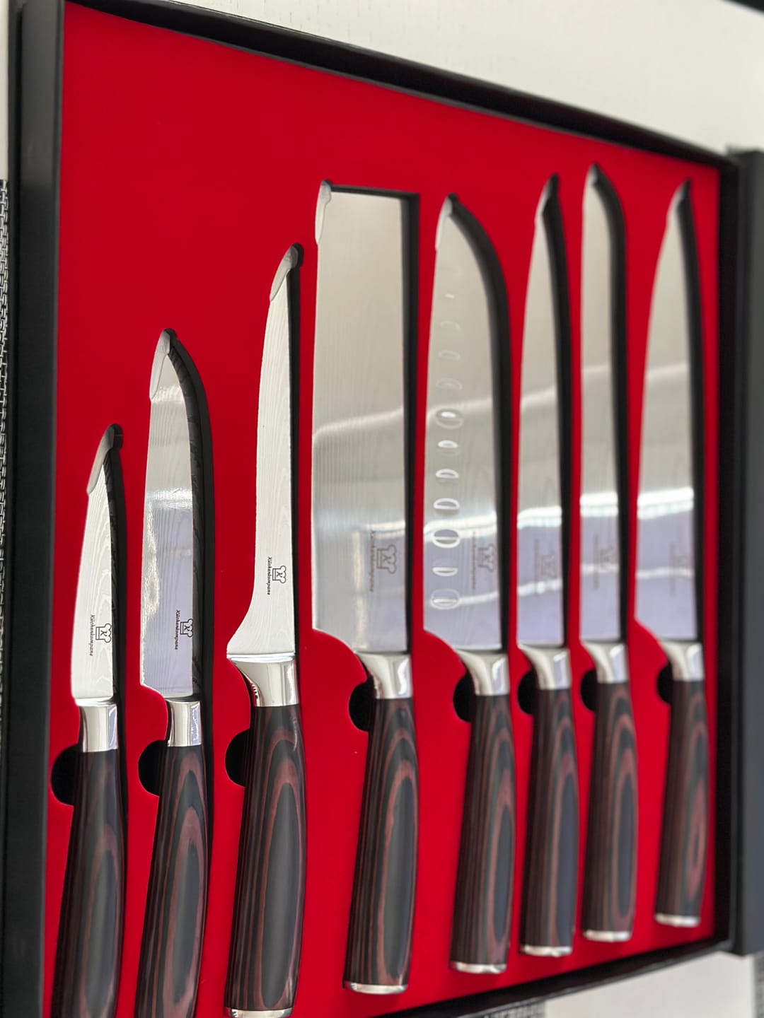 The 8-piece knife set has been specially put together to perfectly master any cutting task in the kitchen. Each knife has its own purpose: